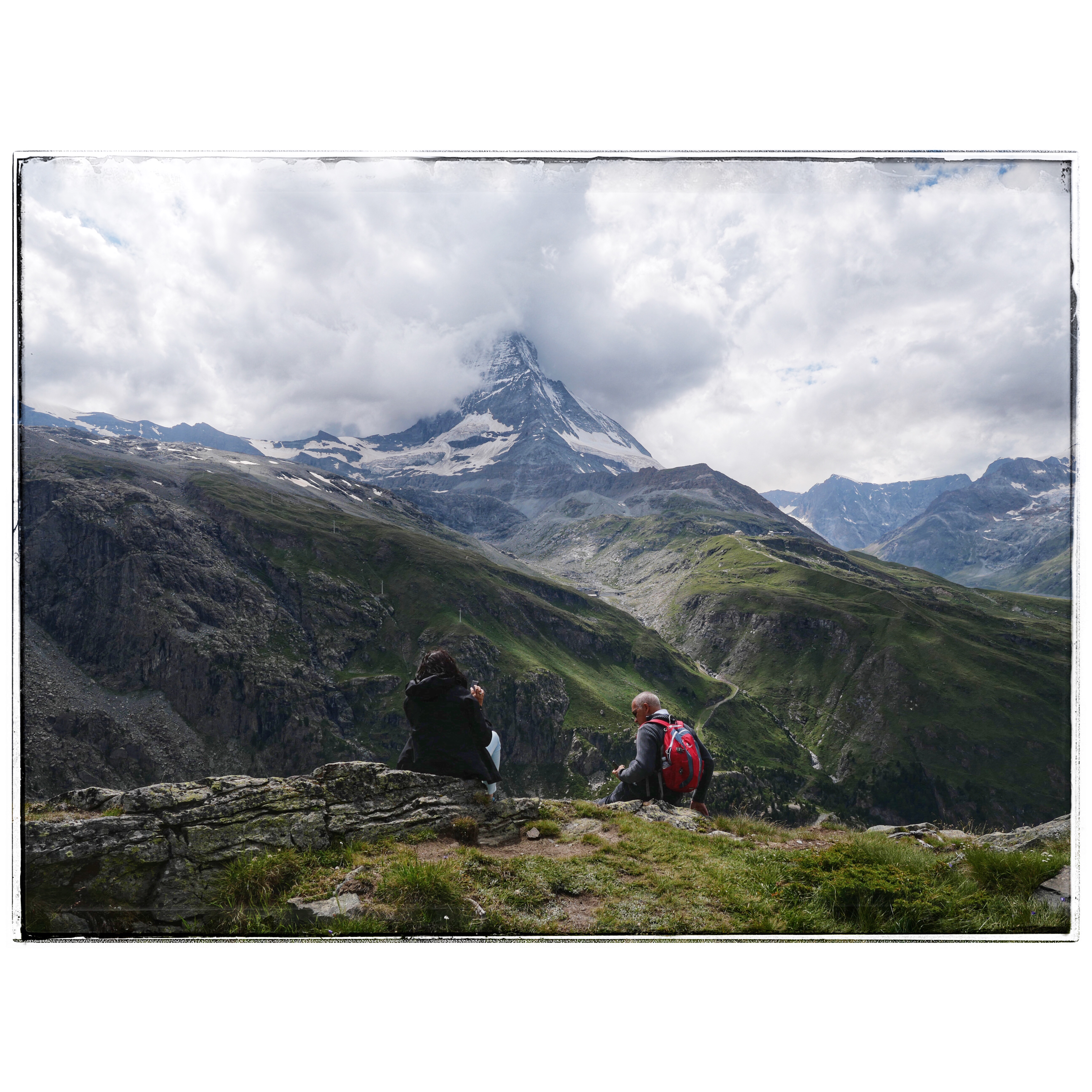De Zermat a 3100 metros de altitud en tren de cremallera, para luego descender un desnivel de 1000 metros y volver a coger el tren a Zermat. Con el Matterhorn, o Cervino,… o la montañita de los Toblerone, presidiendo el paisaje… con nubes.