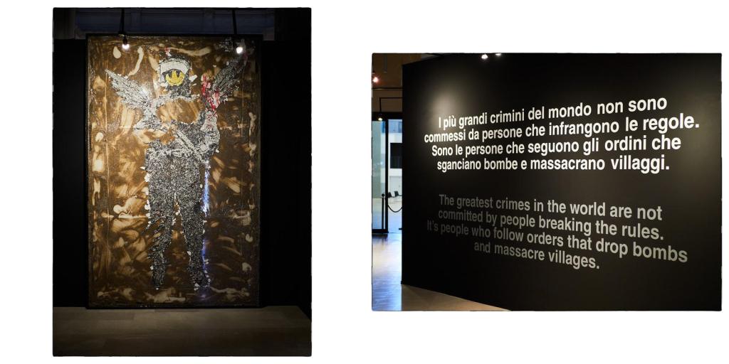 En Bari, junto al puerto deportivo de Bari, destaca la mole rosada del teatro Margherita. Y allí, nada más salir a visitar el centro histórico de Bari, nos encontramos con una exposición dedicada a Banksy. El popular artista contemporáneo cuyos estarcidos sobre las paredes de las ciudades británicas se han vuelto muy populares y por los que muchos están dispuestos a pagar una buena suma. O por alguna reproducción original de los mismos sobre papel
