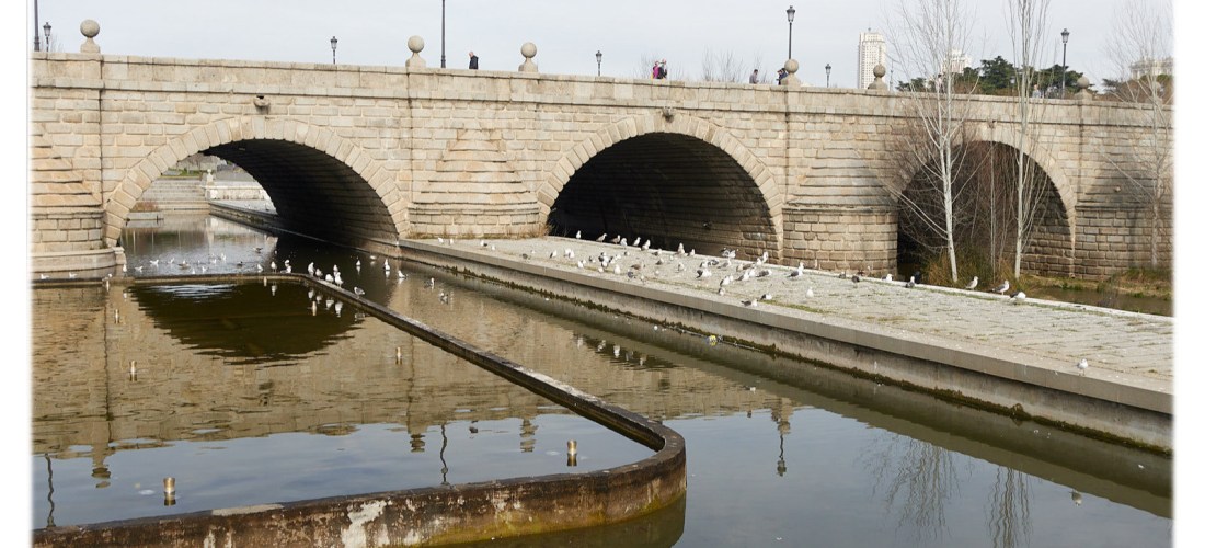 Tenía interés en conocer la oferta cultural y las instalaciones de Matadero Madrid, estuve brevemente hace un tiempo en una exposición. Y además me habían recomendado la visita al Palacio de Cristal de Arganzuela, un jardín botánico bajo invernaderos, que me habían asegurado habría todos los días, siendo gratuita la entrada. Hay que recordar que los lunes suele ser día de cierre en museos y exposiciones, pero un jardín… Bueno, pues la información no fue de fiar y estaba cerrado. No obstante el paseo por el lugar fue agradable, nos tomamos unos chismes, y luego iniciamos un recorrido por Madrid Río, la zona verde que sigue el curso del Manzanares hasta el puente de Segovia. Muy agradable también.