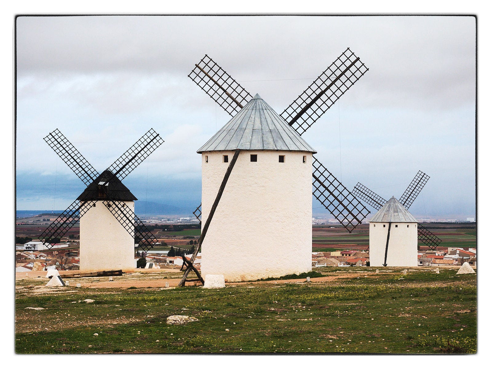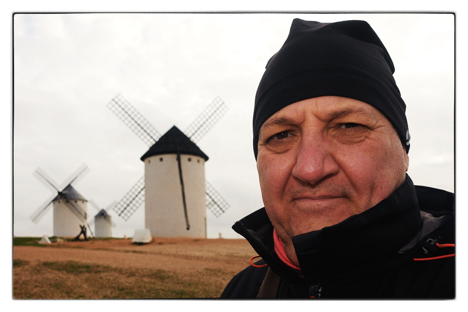 También se daba la circunstancia que estaba cansado… por una serie de cuestiones que no vienen al caso. Cansado… psicológicamente, no físicamente. Y necesitaba airearme. Así que después de considerar pros y contras, y viendo la posibilidad de acceder a estas ciudades manchegas que he mencionado con el tren de forma razonablemente sencilla y rápida, me decidí a irme solo tres días, dos noches. Desde el miércoles 5 de marzo, fiesta local en Zaragoza, hasta el viernes 7 de marzo. Hoy sábado, 8 de marzo, estaba prevista una salida de ASAFONA Asociación aragonesa de fotógrafos de naturaleza, al valle de Aisa en los Pirineos, pero se ha suspendido por las malas previsiones del tiempo. Por lo tanto, el objeto del viaje no era precisamente estresarme intentando cubrir el máximo espacio en el tiempo disponible. Al contrario. Era pasear por los lugares a visitar con tranquilidad, sin estrés, disfrutando de un paisaje que no conocía con antelación. Un paisaje marcado por la fama del Don Quijote de Miguel de Cervantes. Muchos han querido situar los molinos con lo que “guerreó” el hidalgo manchego en el cerro de los Molinos del Campo de Criptana.