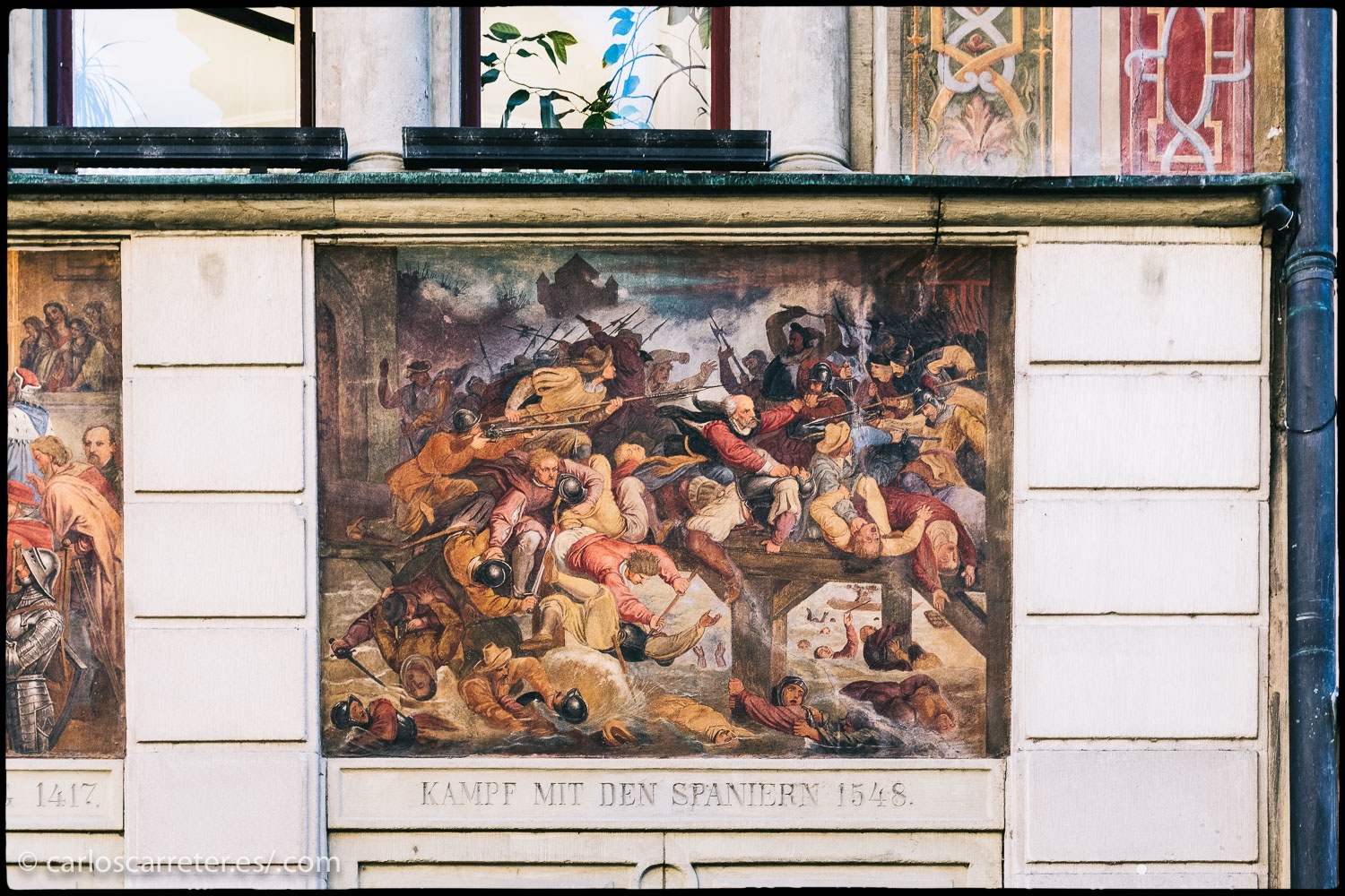 Mural en Constanza que habla de una batalla contra «los españoles» en 1548; más bien, contra las tropas católicas del emperador del Sacro Imperio Carlos V… también I de España.