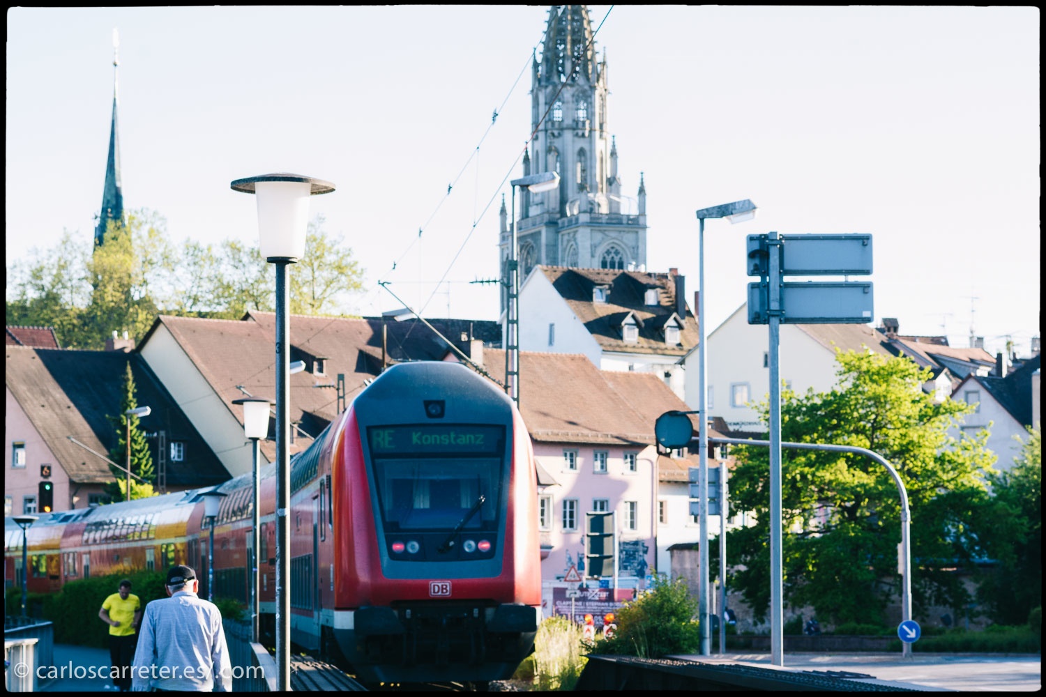 Un tren de los ferrocarriles alemanes se dirige a la estación fronteriza de Constanza, con la torre de la catedral al fondo.