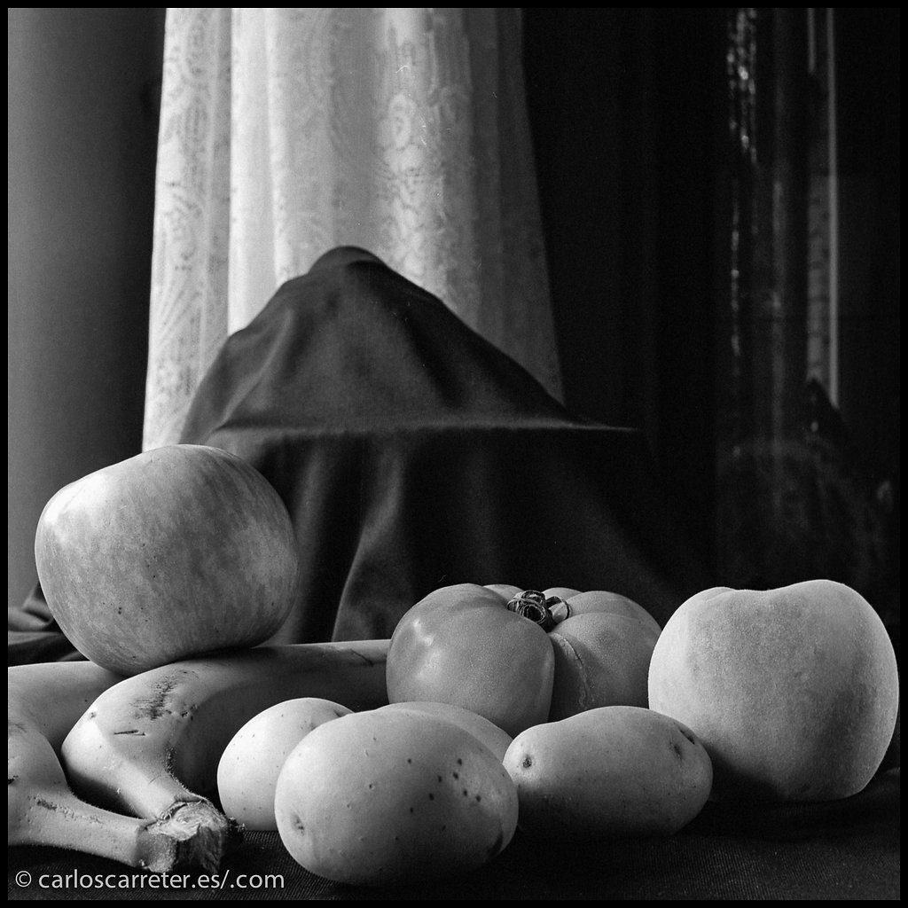 Comencé la semana comentando los resultados de practicar el bodegón con una cámara de formato medio como es la Hasselblad 503CX, calzada con el objetivo estándar Carl Zeiss Planar 80/2,8 y un tubo de aproximación de 10 mm. Película en blanco y negro Kodak Tri-X revelada en Rodinal.