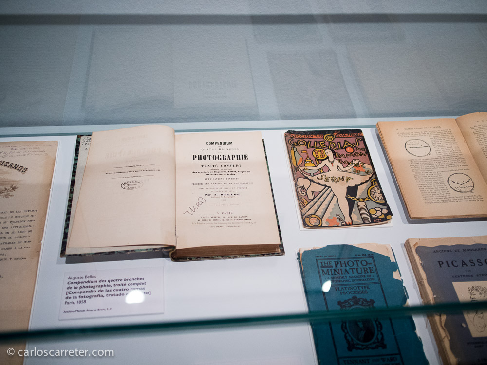 Expuestos, entre las abundantes fotografías, algunos de los libros técnicos de la biblioteca de Álvarez Bravo.
